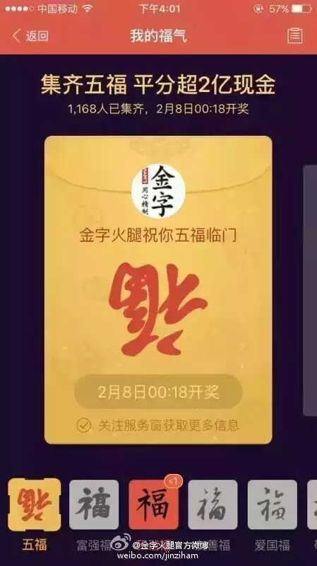 自前幾天支付寶將“集5福,搶2億+紅包”的活動(dòng)規(guī)則公布后,一時(shí)間,有關(guān)??〒Q贈(zèng)的話題強(qiáng)行霸屏。在有金字粉絲集齊了五福后,金字順勢(shì)在微博平臺(tái)上策劃的#我與2億只差一張???的微話題就引發(fā)了高達(dá)4.6億的閱讀量,網(wǎng)友們通過點(diǎn)贊評(píng)論及轉(zhuǎn)發(fā)分享的方式,第一時(shí)間表達(dá)了自己對(duì)于五福??ê痛和?億紅包的高度期待!