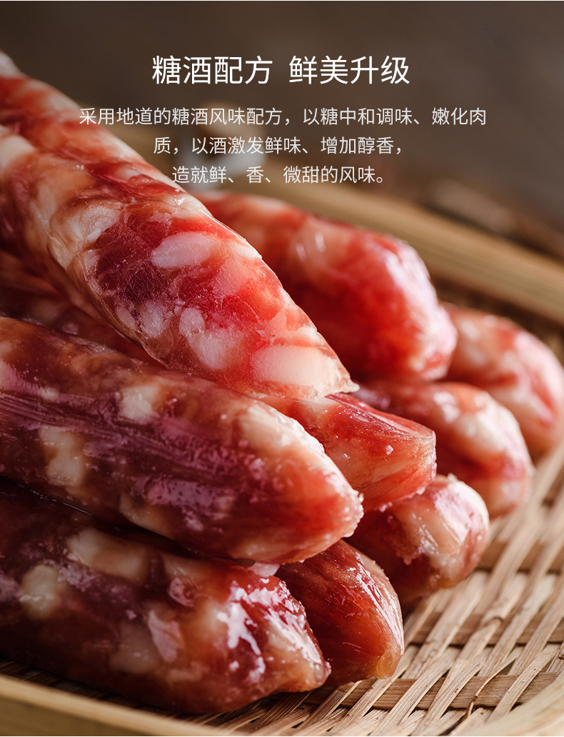 - 豬肉、白砂糖、大豆蛋白、食用鹽、白酒、膠原蛋白腸衣、味精、食品添加劑(甜菜紅、紅曲紅、亞硝酸鈉)