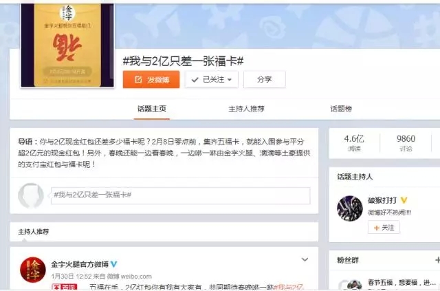 自前幾天支付寶將“集5福,搶2億+紅包”的活動(dòng)規(guī)則公布后,一時(shí)間,有關(guān)??〒Q贈(zèng)的話題強(qiáng)行霸屏。在有金字粉絲集齊了五福后,金字順勢(shì)在微博平臺(tái)上策劃的#我與2億只差一張???的微話題就引發(fā)了高達(dá)4.6億的閱讀量,網(wǎng)友們通過點(diǎn)贊評(píng)論及轉(zhuǎn)發(fā)分享的方式,第一時(shí)間表達(dá)了自己對(duì)于五福??ê痛和?億紅包的高度期待!