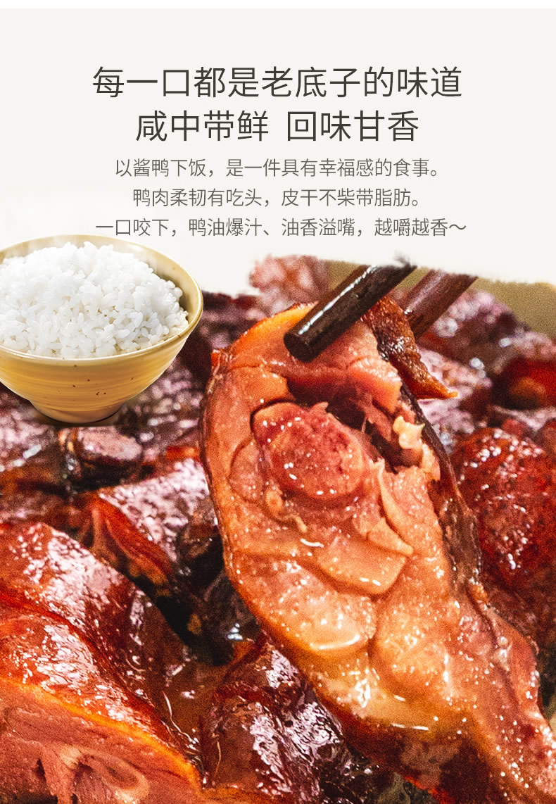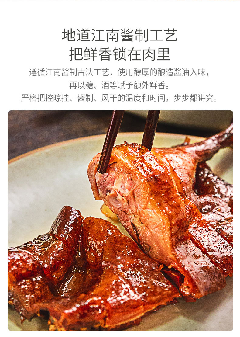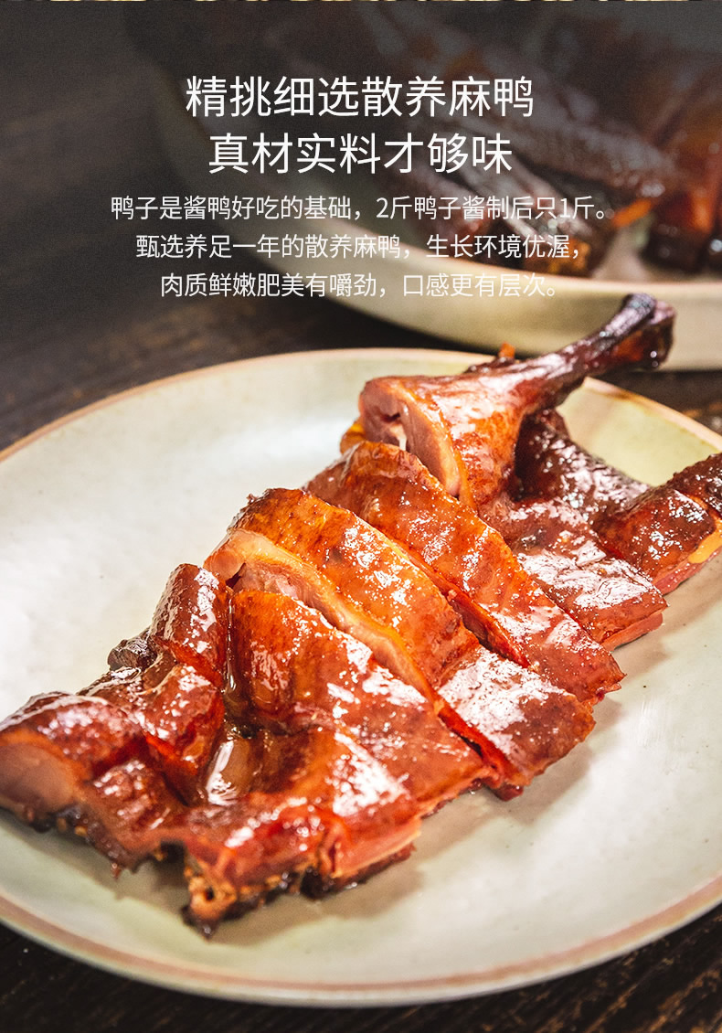 - 鴨、釀造醬油、白砂糖、白酒、味精、食用鹽、食品添加劑(亞硝酸鈉、紅曲紅)