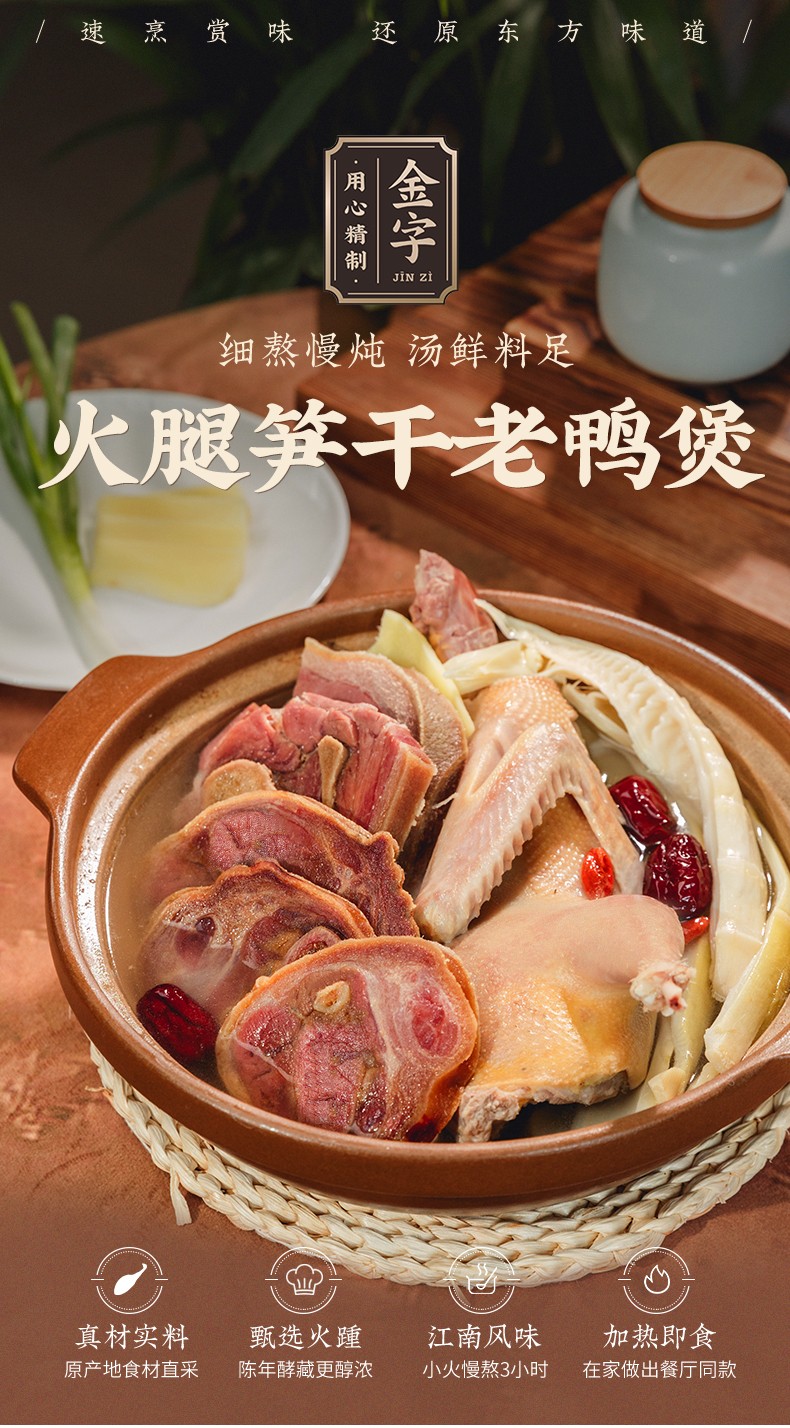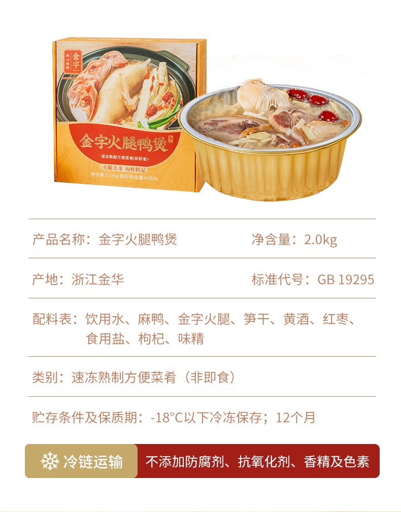 - 飲用水、麻鴨、金字火腿、筍干、黃酒、紅棗、食用鹽、枸杞、味精